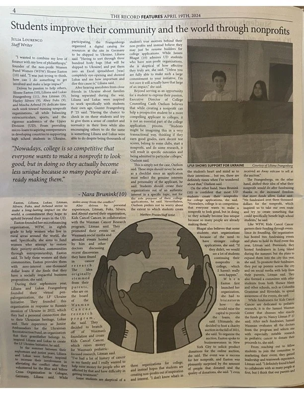 In December of 2022, Lukas and Liliana raised twenty-five hundred dollars for the Ukraine Reconstruction Fund, a non-profit organization based on Facebook. They fundraised by sending out emails to their community and raising awareness at their school.